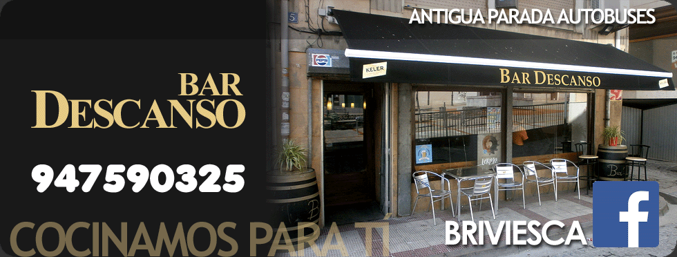 Bar Descanso, 947590325, Pza. Santa Casilda, 5, Briviesca, Almuerzos, Desayunos, Tapas, Raciones, Comidas, Cenas, Pollos asados, Paellas, Olla podrida, Jabali, Corzo, Bocadillos, Platos combinados, Briviesca, La Bureba, Comer en la bureba, cenar en la bureba, comidas para grupos en briviesca, comidas para grupos en la bureba, vermut, pintxos, almorzar, comer, cenar, briviesca, la bureba, bar el descanso, bar, restaurante, descanso, briviesca, la bureba, Belorado, Burgos, Comer bien en Briviesca, De tapas por briviesca, la bureba, de pinchos por briviesca, la bureba, paellas en briviesca, pollos asados en briviesca, la bureba, bar tipico en briviesca, la bureba. Bar Descanso en Briviesca, Zona de La Bureba te ofrece los mejores almuerzos de la zona, comidas de encargo, cenas todos los dias, platos combinados, bocadillos, raciones y una gran variedad de tapas. Cocinamos cualquier plato por encargo, corzo, jabali, paellas, pollos asados, olla podrida...Una experiencia gastronomica. Estamos en la antigua parada de autobuses de Briviesca. en la Plaza Santa Casilda. A un minuto de la plaza Mayor de Briviesca. Gran variedad de tapas y raciones. Menus para grupos. Menus diarios para cenar. Cenas de cumpleaños. Cenas entre amigos en la Bureba.